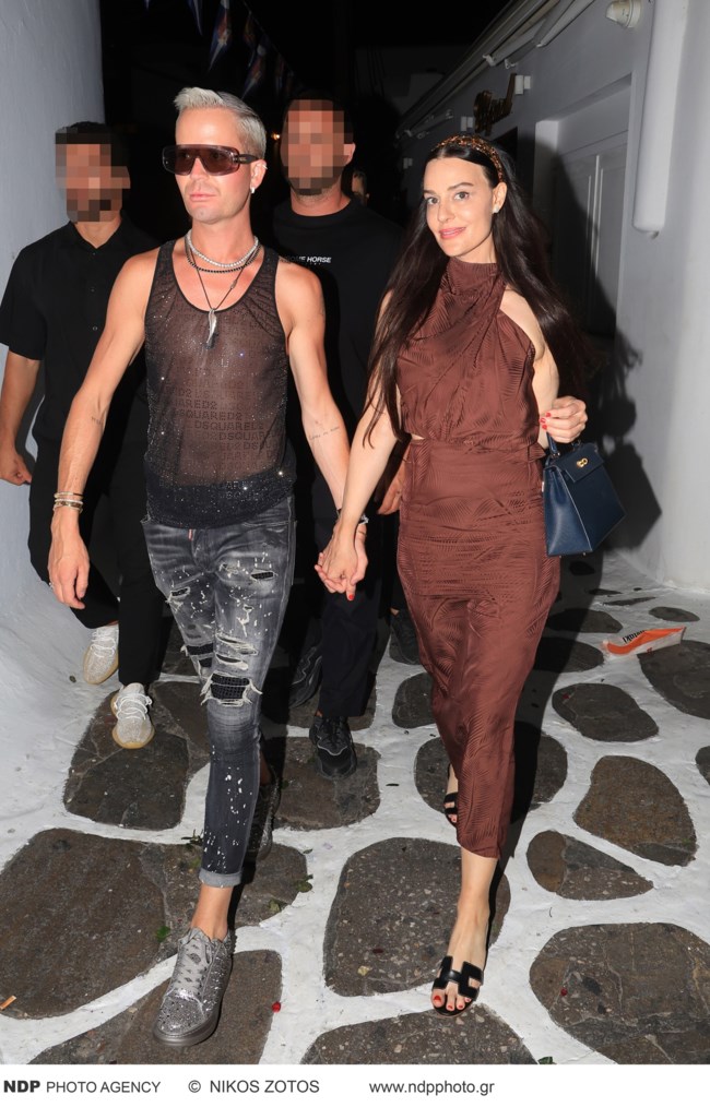 Για τη βραδινή τους βόλτα στα σοκάκα, η Αριανα Ροκφέλερ επέλεξε ένα μακρύ φόρεμα σε καφέ απόχρωση, ενώ ο Τζακ Μόργκαν τζιν και ημιδιάφανο τοπ με λάμψεις.