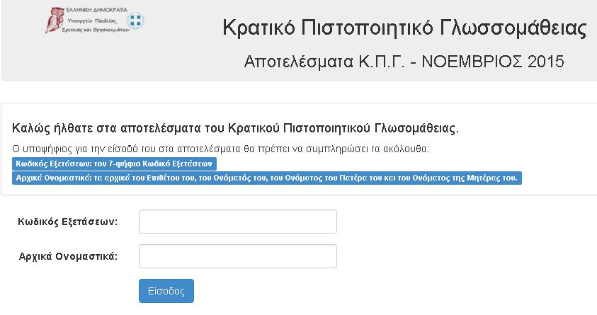 αποτελέσματα των εξετάσεων του Κρατικού Πιστοποιητικού ΓλωσσομάθειαςΝοεμβρίου 2015, για τις γλώσσες : Αγγλική, Γαλλική, Γερμανική, Ιταλική,Ισπανική και Τουρκική.