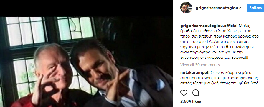 «Μόλις έμαθα ότι πέθανε ο Χιου Χεφνερ... του πήρα συνέντευξη πριν κάποια χρόνια στο σπίτι του στο LA... Απίστευτος τύπος, πήγαινα με την ιδέα ότι θα συναντήσω έναν πορνόγερο και έφυγα με την εντύπωση ότι γνώρισα μια ευφυΐα!!!!
