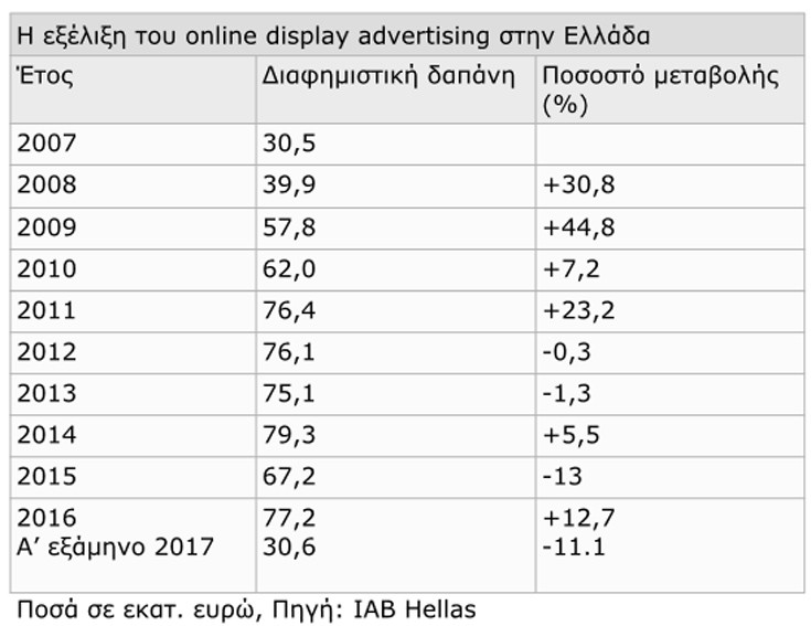 Η επιμέρους μελέτη της διαφημιστικής δαπάνης για το digital display, σύμφωνα με την ΑDEX του ΙΑΒ Hellas, αποτυπώνει μια είσπραξη της τάξεως των 30,6 εκατ. ευρώ για το α’ εξάμηνο (Q1 + Q2 μαζί).