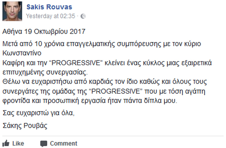 κοινής πορείας ο Σάκης Ρουβάς και η εταιρία επικοινωνίας Progressive, ανακοίνωσαν τη λήξη της συνεργασίας τους.