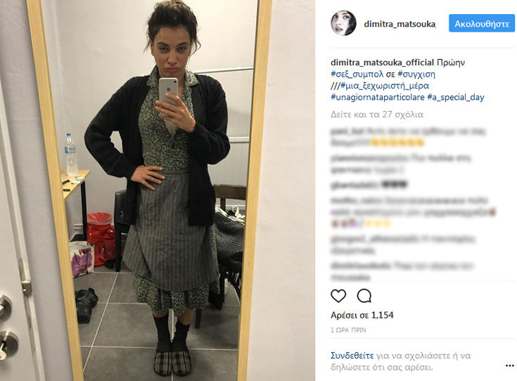 Η φωτογραφία είναι από τα καμαρίνια του θεάτρου όπου η Δήμητρα Ματσούκα πρωταγωνιστεί στην παράσταση «Μια ξεχωριστή μέρα» με τον Σταύρο Ζαλμά και η συγκεκριμένη αμφίεση υιοθετήθηκε για τις ανάγκες του ρόλου της.