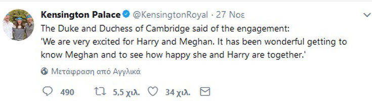 Μετά την αναγγελία του αρραβώνα ο πρίγκιπας Γουίλιαμ και η Κέιτ εξέδωσαν επίσημη ανακοίνωση στην οποία δήλωναν: «Είμαστε πολύ ενθουσιασμένοι για τον Harry και την Meghan. Ήταν υπέροχο να γνωρίσουμε τη Meghan και να δούμε πόσο χαρούμενη είναι εκείνη και ο Harry μαζί».
