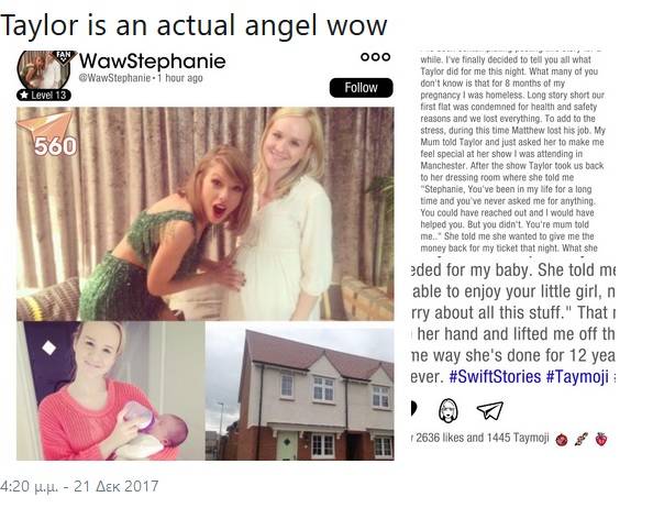 «Η μητέρα μου το είπε στην Τέιλορ και απλώς της ζήτησε να με κάνει να νιώσω λίγο ξεχωριστή σε μια συναυλία της στο Μάντσεστερ, που εγώ είχα σκοπό να πάω. Μετά το σόου η Τέιλορ μας πήρε πίσω στο καμαρίνι της κι εκεί μου είπε, "Στέφανι, είσαι στη ζωή μου εδώ και πολύ καιρό και ποτέ δεν μου ζήτησες τίποτα. Θα μπορούσες να μου μιλήσεις και να σε βοηθήσω. Αλλά δεν το έκανες. Η μαμά σου μου είπε...". Μετά μου είπε πως ήθελε να μου επιστρέψει τα χρήματα του εισιτηρίου. Εκείνο που έκανε στην πραγματικότητα ήταν να μας βοηθήσει να αγοράσουμε ένα σπίτι και όσα χρειαζόμουν για το μωρό μου. Μου είπε, "Θέλω να μπορείς να απολαύσεις την κορούλα σου, να μην έχεις να ανησυχείς για όλα αυτά"», προσθέτει.