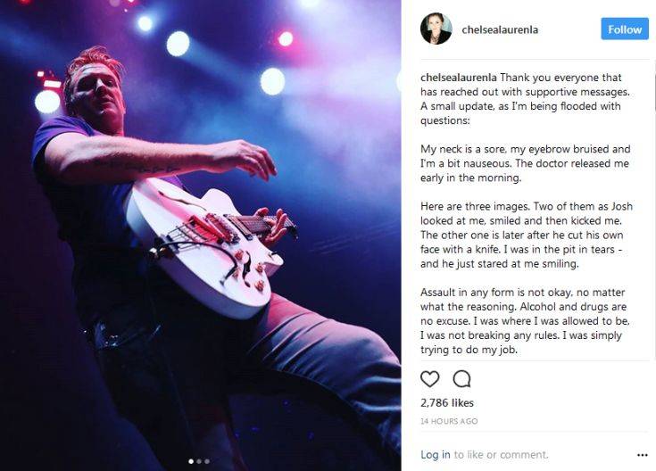 συγκροτήματος Queens of the Stone Age, τραγουδιστής και κιθαρίστας της μπάντας, Τζος Χομ, ζήτησε χθες συγγνώμη, επειδή κλώτσησε μια φωτογράφο στο πρόσωπο, την ώρα που εκείνη έβγαζε φωτογραφίες την ώρα συναυλίας.