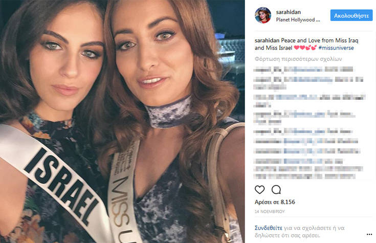 Για μία selfie η οικογένεια της «Μις Ιράκ» αναγκάστηκε να εγκαταλείψει τη χώρα αφού η φωτογραφία της πανέμορφης κοπέλας με την «Μις Ισραήλ» προκάλεσε θύελλα αντιδράσεων στα social media με πολλούς χρήστες να απειλούν ότι θα σκοτώσουν αυτήν και τα μέλη της οικογένειάς της.