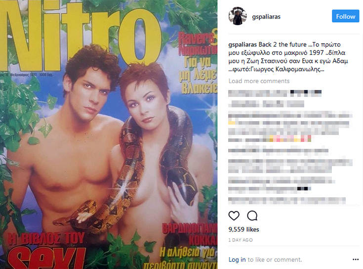 «Το πρώτο μου εξώφυλλο στο μακρινό 1997... δίπλα μου η Ζωή Στασινού σαν Εύα κ εγώ Αδάμ… φωτό: Γιώργος Καλφομανώλης» έγραψε χαρακτηριστικά.