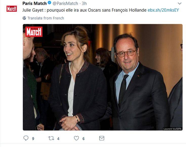Ο παρουσιαστής δεν ικανοποιήθηκε από την απάντηση και ρωτά την Γκαγιέ αν όταν θα πάει στο Λος Άντζελες θα συνοδεύεται από τον Φρανσουά Ολάντ. «Όχι, δεν θα συνοδεύομαι. Είναι αλήθεια ότι ο καθένας έχει τη δουλειά του και τις υποχρεώσεις του και το σεβόμαστε αυτό. Και παρότι συνδεόμαστε στενά, είμαστε πολύ κοντά, όχι, θα είμαι μόνη», απάντησε.