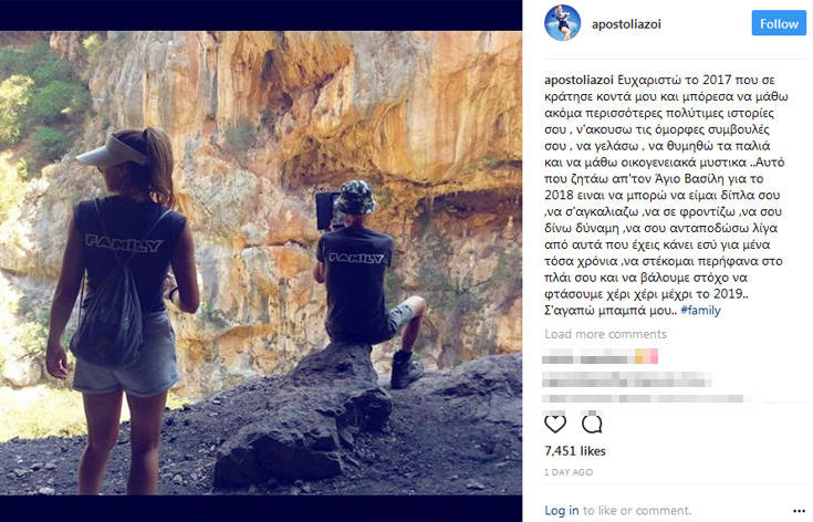 «Ευχαριστώ το 2017 που σε κράτησε κοντά μου και μπόρεσα να μάθω ακόμα περισσότερες πολύτιμες ιστορίες σου, ν’ακουσω τις όμορφες συμβουλές σου , να γελάσω , να θυμηθώ τα παλιά και να μάθω οικογενειακά μυστικά ... Αυτό που ζητάω απ’ τον Άγιο Βασίλη για το 2018 είναι να μπορώ να είμαι δίπλα σου, να σ' αγκαλιάζω, να σε φροντίζω, να σου δίνω δύναμη, να σου ανταποδώσω λίγα από αυτά που έχεις κάνει εσύ για μένα τόσα χρόνια ,να στέκομαι περήφανα στο πλάι σου και να βάλουμε στόχο να φτάσουμε χέρι χέρι μέχρι το 2019... Σ’ αγαπώ μπαμπά μου».