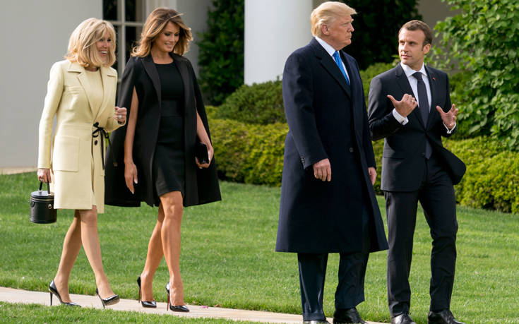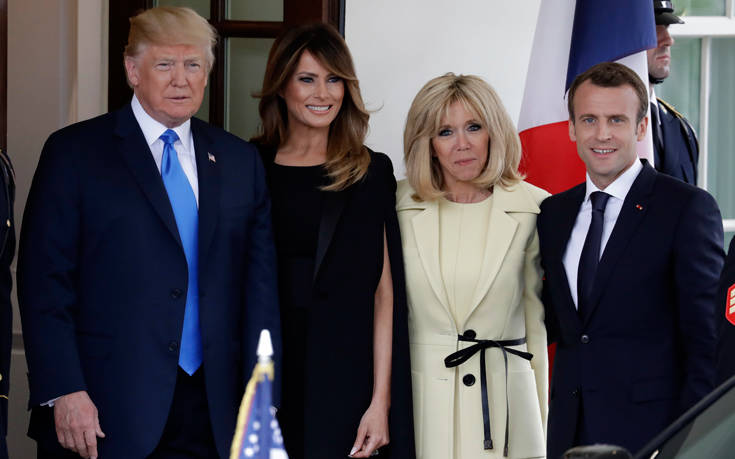 Για να υποδεχτεί στον Λευκό Οίκο τους επίσημους καλεσμένους της, η Μελάνια επέλεξε τη διαχρονική κομψότητα ενός μαύρου φορέματος σε ίσια γραμμή του οίκου Dolce & Gabbana το οποίο συνδύασε με μαύρη κάπα του γαλλικού οίκου Givenchy. Απέναντι της, η Μπριζίτ Μακρόν, πιστή στον οίκο Vuitton, διάλεξε ένα σύνολο --φόρεμα και μαντό-- στο χρώμα της σαμπάνιας, με ασύμμετρη μαύρη λεπτή ζώνη που έδενε με φιόγκο.
