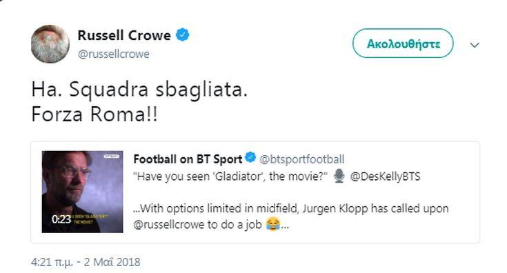 Τι το ήθελε το χιούμορ; Ο Αυστραλός ηθοποιός έμαθε την ατάκα του Γερμανού τεχνικού και απάντησε μέσω Twitter: «Χα, λάθος ομάδα! Φόρτσα Ρόμα!», έγραψε, για να πέσουν... βροχή τα αποθεωτικά σχόλια από οπαδούς της ιταλικής ομάδας.