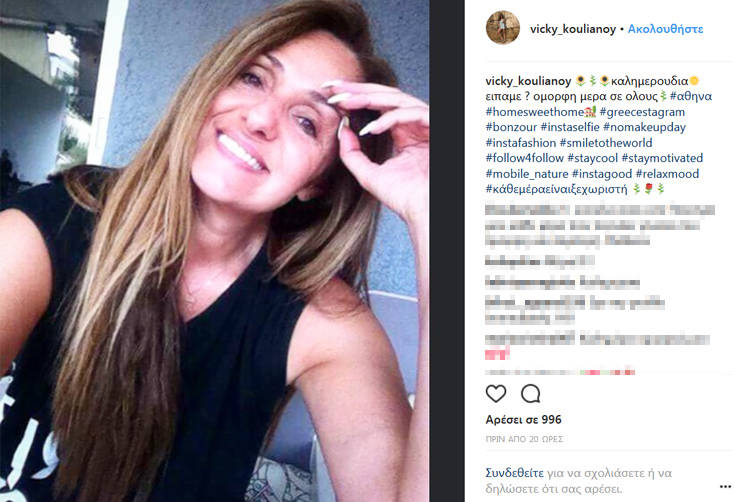 Η Βίκυ Κουλιανού πόζαρε στο Instagram χωρίς ίχνος μακιγιάζ, όπως γράφει σε ένα από τα hashtag που επέλεξε να βάλει.