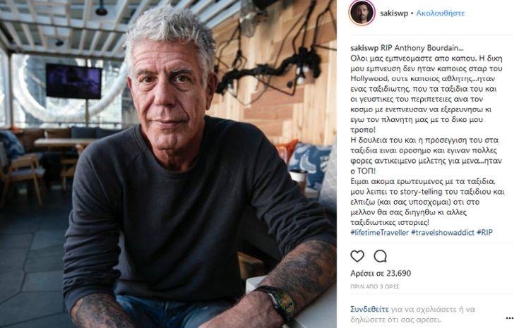 «RIP Anthony Bourdain… Όλοι μας εμπνεόμαστε από κάπου. Η δική μου έμπνευση δεν ήταν κάποιος σταρ του Hollywood, ούτε κάποιος αθλητής… ήταν ένας ταξιδιώτης, που τα ταξίδια του και οι γευστικές του περιπέτειες ανά τον κόσμο με ενέπνευσαν να εξερευνήσω κι εγώ τον πλανήτη μας με το δικό μου τρόπο! Η δουλειά του και η προσέγγιση του στα ταξίδια είναι ορόσημο και έγιναν πολλές φορες αντικείμενο μελέτης για μένα… ήταν ο ΤΟΠ! Είμαι ακόμα ερωτευμένος με τα ταξίδια, μου λείπει το story-telling του ταξιδιού και ελπίζω (και σας υπόσχομαι) ότι στο μέλλον θα σας διηγηθώ κι άλλες ταξιδιωτικές ιστορίες!».