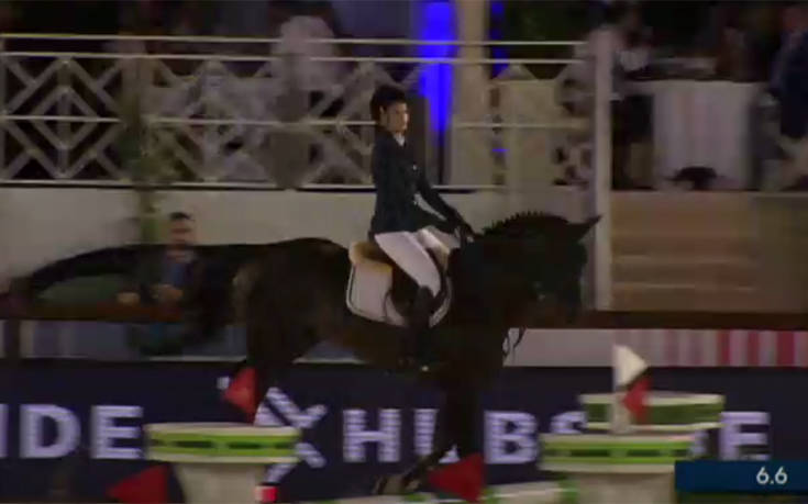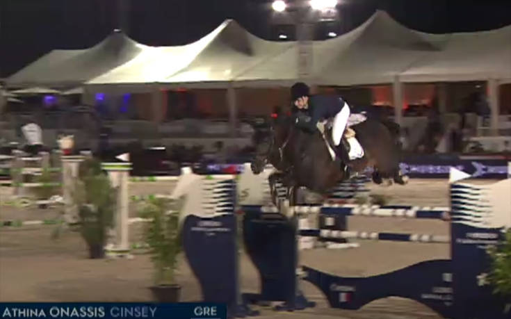 Η Αθηνά Ωνάση την ώρα του αγώνα φαίνεται να χάνει την ισορροπία της και να πέφτει από το άλογο.