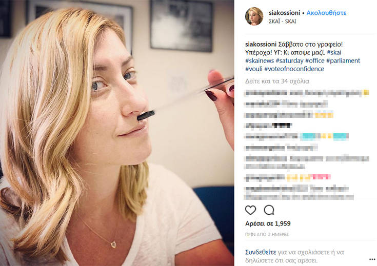 Η ίδια ανέβασε μια φωτογραφία της χωρίς μακιγιάζ και τη λεζάντα έγραψε: «Σάββατο στο γραφείο! Υπέροχα! ΥΓ: Κι απόψε μαζί. #skai#skainews #saturday #office #parliament#vouli #voteofnoconfidence».