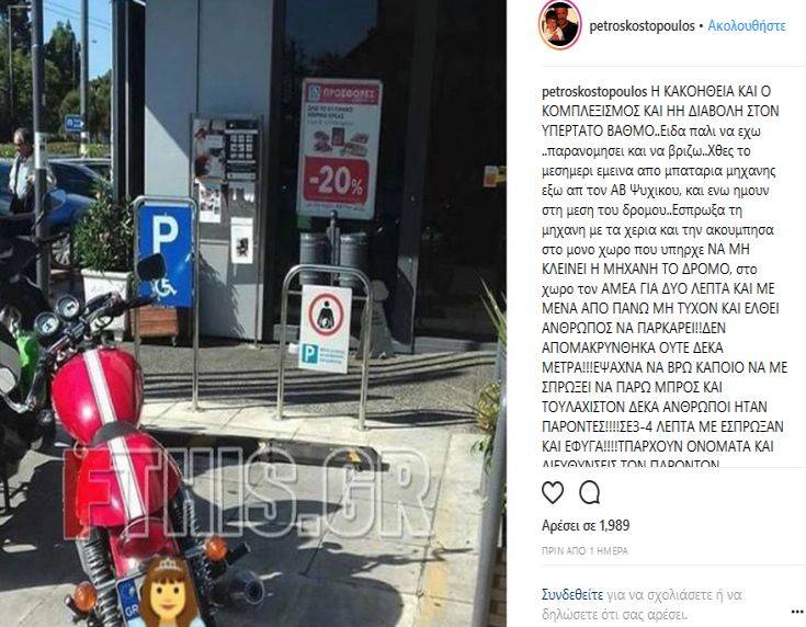 «Η μηχανή αυτή παρκαρισμένη σε χώρο για ηλικιωμένους και εγκυμονούσες ανήκει στον γνωστό μπουρτζοβλαχο #ΠετροςΚωστοπουλος . Έτυχε να τον πετύχω καθώς πήγαινε να την πάρει του λέω “Δεν σε χάλασε η φώτο που σε πήρα” και μου λέει το θρυλικό “Σε γράφω στ’αρχ@@ μου”».