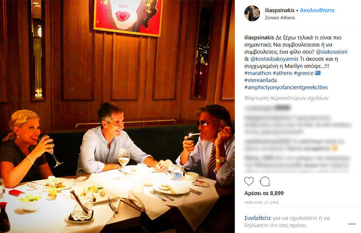 Και οι τρεις φαίνονται ιδιαίτερα ευδιάθετοι, με τον δήμαρχο Μαραθώνα να συνοδεύει τη φωτογραφία με το εξής μήνυμα: «Δε ξέρω τελικά τι είναι πιο σημαντικό; Να συμβουλεύεσαι ή να συμβουλεύεις ένα φίλο σου? @siakossioni & @kostasbakoyannis Τι άκουσε και η συγχωρεμένη η Marilyn απόψε...!!!».