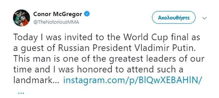 Ωστόσο, ο Κόνορ ΜακΓκρέγκορ δεν είχε τέτοιο άγχος, καθώς παρακολούθησε την αναμέτρηση σε μια από τις καλύτερες θέσεις του γηπέδου, διότι -όπως αποκάλυψε ο ίδιος- ήταν καλεσμένος του Βλαντιμίρ Πούτιν. Μάλιστα, οι δύο άνδρες είχαν την ευκαιρία να τα πουν πριν το χθεσινό παιχνίδι και να φωτογραφηθούν μαζί.