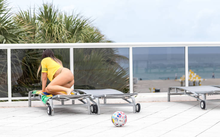 Η καυτή τηλεπερσόνα φόρεσε μια μπλούζα στα χρώματα της Βραζιλίας, πήρε μία μπάλα και επιδόθηκε στις γνωστές σέξι φιγούρες της.