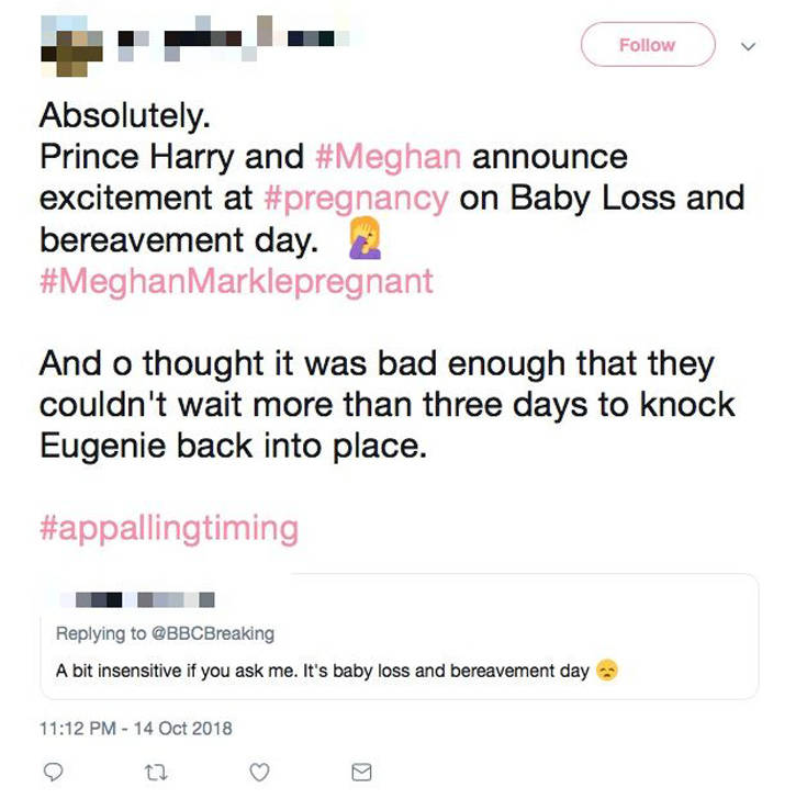 Κι εκατοντάδες χρήστες θεώρησαν ως την πλέον άσχετη ημέρα για να ανακοινώσουν ότι η Μέγκαν Μαρκλ θα γίνει μητέρα, θεωρώντας ότι θα μπορούσαν να περιμένουν και να την έκαναν την επομένη, ως ένδειξη σεβασμού.