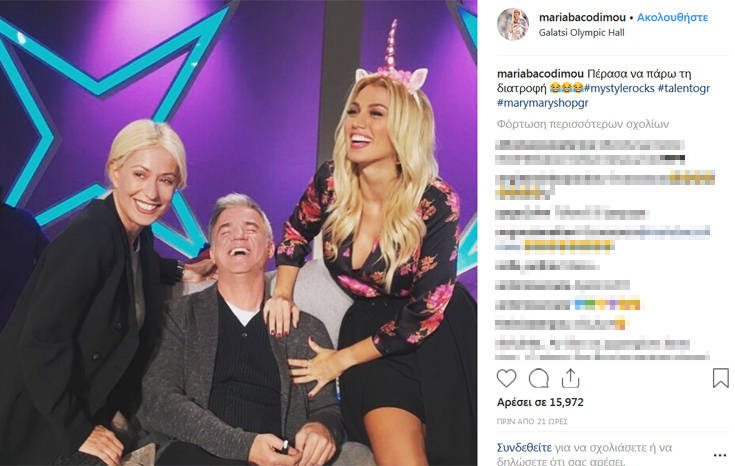 Και ανέβασε στον προσωπικό της λογαριασμό στο Instagram μία φωτογραφία, όπου ποζάρει με τον Αργυρόπουλο και την Κωνσταντίνα Σπυροπούλου. Ωστόσο, την παράσταση από την επίμαχη φωτογραφία «κλέβει» το σχόλιο της παρουσιάστριας που τη συνόδευσε. «Πέρασα να πάρω τη διατροφή» έγραψε, συνοδεύοντας το σχόλιο με emojis που γελάνε. Λίγο πιο κάτω, ο πρώην σύζυγός της σχολίασε: «Τι άλλο να κάνω ρε Μαράκι ... σπαθιά να καταπιώ» για να απαντήσει εκείνη: «θυσία γίνεται ο πατέρας».