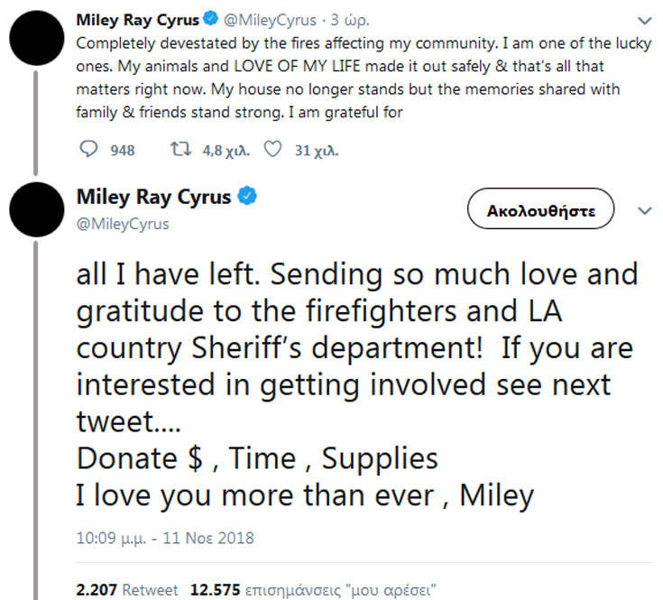 Και η Μάιλι Σάιρους είδε την έπαυλη της στο Μαλιμπού να παραδίνεται στις φλόγες. Η νεαρή τραγουδίστρια με tweets ανέφερε ότι η οικογένεια της και τα ζώα της είναι όλοι τους καλά και πως αυτό έχει σημασία. Ανάμεσα στους πυρόπληκτους είναι και η Κιμ Καρντάσιαν, αφού το πίσω μέρος του σπιτιού της κάηκε. Η οικογένεια είχε εγκαταλείψει την έπαυλη στο Καλάμπας με το που ξέσπασε η φωτιά, παίρνοντας μαζί λίγα από τα υπάρχοντά τους.