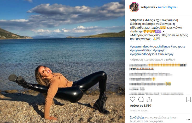Η Σόφη Πασχάλη φορώντας ένα εφαρμοστό μαύρο παντελόνι έκανε μια απίθανη στάση γιόγκα με το ένα πόδι τεντωμένο τέρμα πίσω και φυσικά πόσταρε τη φωτό στο Instagram, κάνοντας τους followers της να αναρωτιούνται πώς το κατάφερε ενώ υπήρξαν και κάποιοι που δεν εντυπωσιάστηκαν με την ευλυγισία της βρίσκοντας ότι αυτή η στάση δεν την κολακεύει.