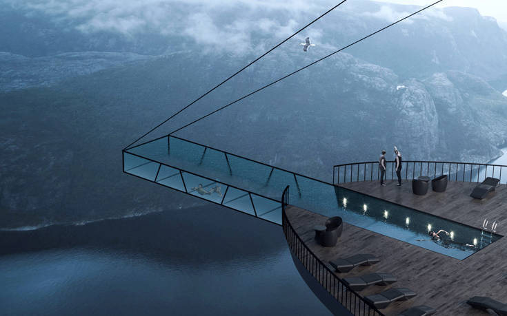 Μια άκρως τρομακτική πισίνα που κρέμεται πάνω από γκρεμό σε βράχο ύψους 600 μέτρων έχει σχεδιάσει το αρχιτεκτονικό γραφείο Hayri Atak Architectural Design Studio στο πλαίσιο του σχεδιασμού ενός boutique ξενοδοχείου στα φιόρδ της Νορβηγίας. Ο γυάλινος πάτος της θα επιτρέπει στους παράτολμους επισκέπτες της να παρατηρούν όση ώρα απολαμβάνουν τις βουτιές τους σε αυτήν την πανοραμική θέα στα φιόρδ κάτω ακριβώς από τα πόδια τους.