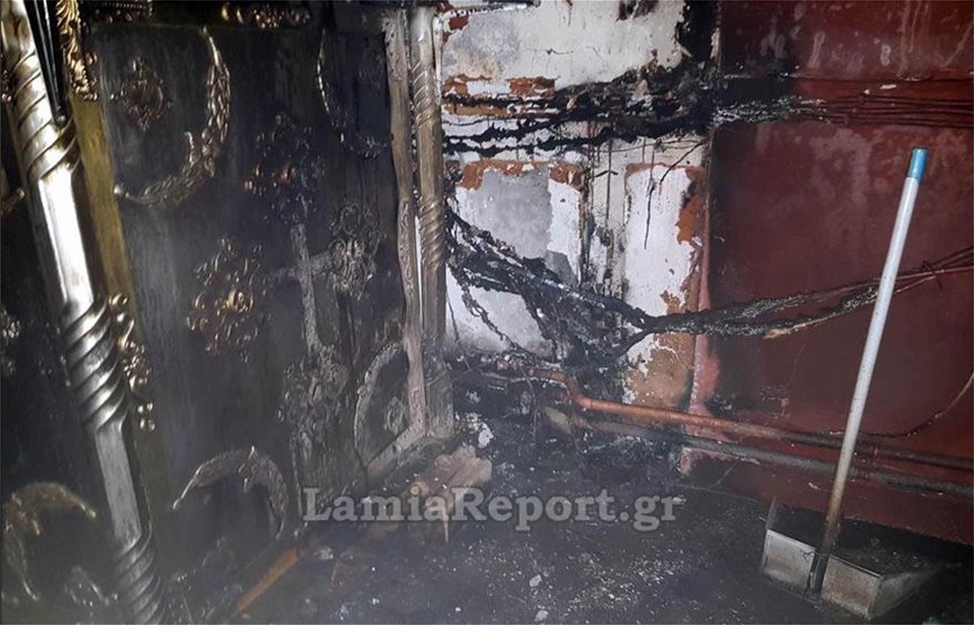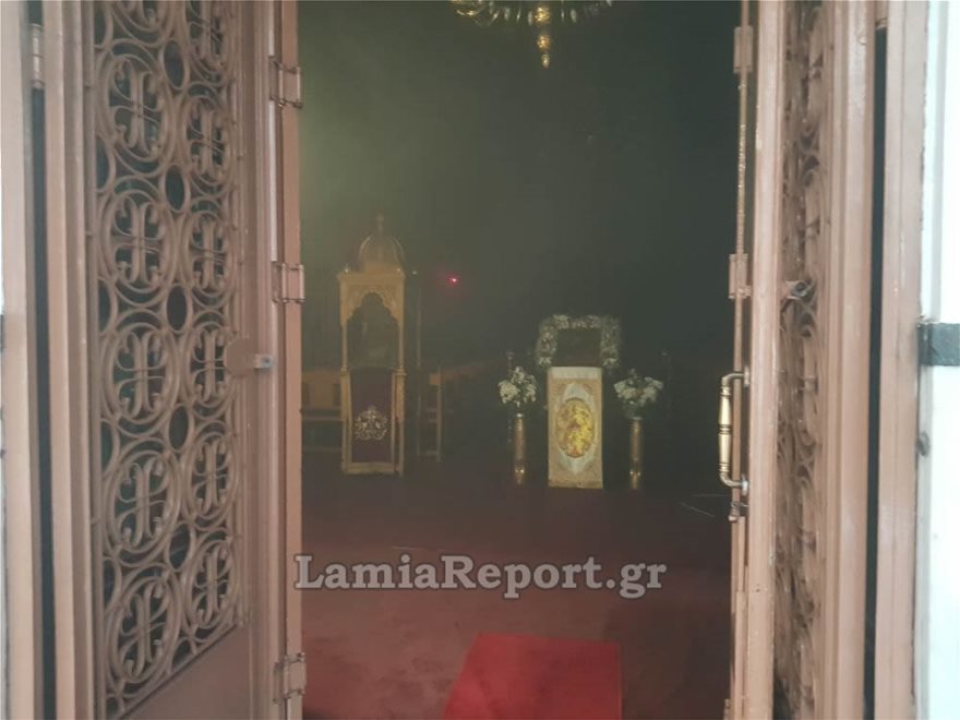Σύμφωνα με το LamiaReport.gr η πυρκαγιά προκλήθηκε από βραχυκύκλωμα με τον ιερό ναό να γεμίζει καπνούς.