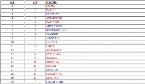 Στις πρώτες θέσεις δεν υπάρχουν και μεγάλες εκπλήξεις καθώς το Γιώργος και το Μαρία κερδίζουν με διαφορά την αγάπη των ελλήνων γονιών που σε αρκετά μεγάλο βαθμό επιλέγουν να δίνουν στα παιδιά ονόματα των παππούδων και των γιαγιάδων τους.