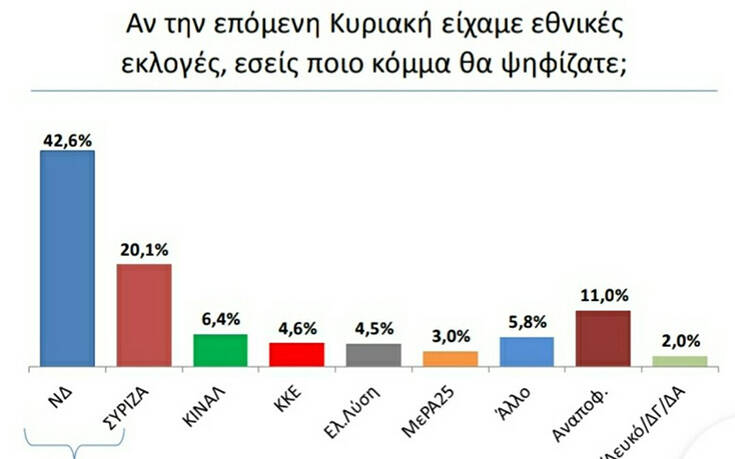 Στη δημοσκόπηση, λοιπόν, αν την επόμενη Κυριακή είχαμε εκλογές η Νέα Δημοκρατία θα συγκέντρωνε 42,6%, ο ΣΥΡΙΖΑ 20,1%, το ΚΙΝΑΛ 6,4%, το ΚΚΕ 4,6%, η Ελληνική Λύση 4,5%, το ΜέΡΑ 25 3%. 5,8% συγκεντρώνει το «άλλο κόμμα», με τους αναποφάσιστους να βρίσκεται στο 11%. Στο 2% βρίσκεται το λευκό ή δεν γνωρίζω - δεν απαντώ.