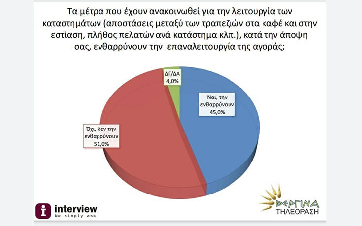 Στην ερώτηση για το αν τα μέτρα για τη λειτουργία των καταστημάτων ενθαρρύνουν την επαναλειτουργία της αγοράς, το 51% απάντησε ότι δεν ενθαρρύνουν, το 45% ότι ενθαρρύνουν και το 4% ΔΓ/ΔΑ.
