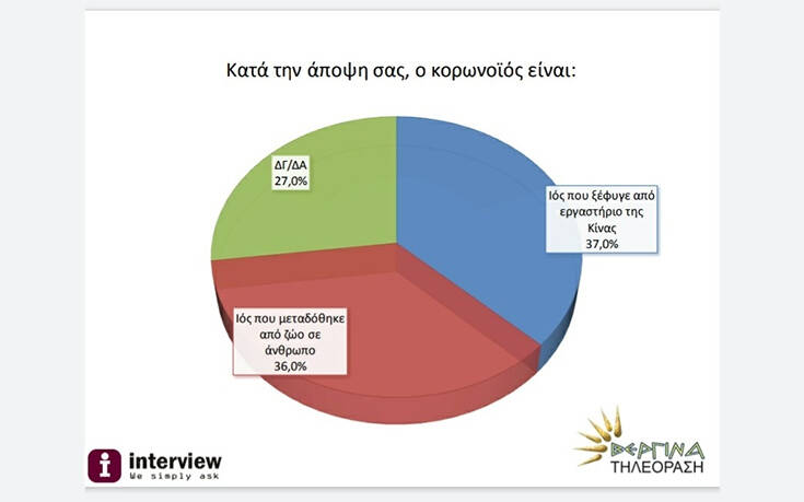 Μεταξύ άλλων ενδιαφέρον παρουσιάζει και η άποψη για τον κορονοϊό. Το 37% πιστεύει ότι ο ιός ξέφυγε από εργαστήριο της Κίνας, το 36% ότι μεταδόθηκε στον άνθρωπο από ζώο, ενώ το 27% ΔΓ/ΔΑ.