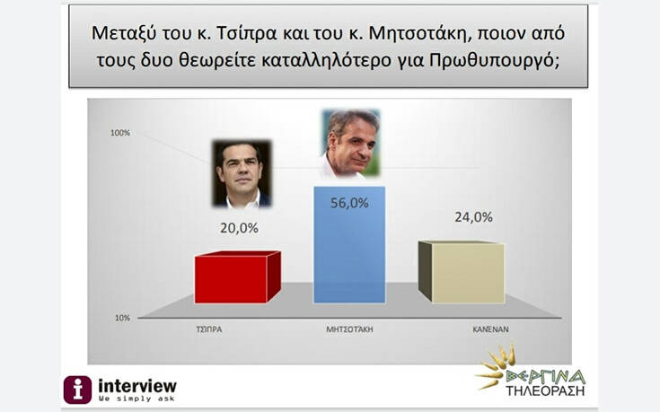 Καταλληλότερος για πρωθυπουργός εμφανίζεται ο Κυριάκος Μητσοτάκης με 56%, έναντι 20% του Αλέξη Τσίπρα. Κανένας από τους δύο απάντησε το 24%.