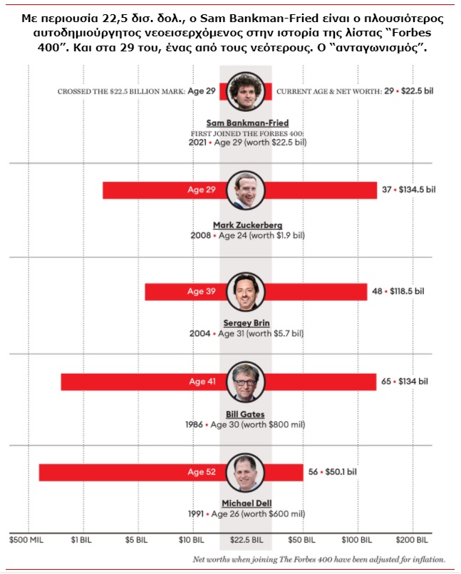 Πριν από τέσσερα χρόνια, ο Bankman-Fried δεν είχε ούτε ένα bitcoin στην κατοχή του. Όμως, προ ημερών -και πέντε μήνες πριν τα 30ά γενέθλιά του- έκανε το ντεμπούτο του στην φετινή λίστα του Forbes με τους 400 πλουσιότερους ανθρώπους του πλανήτη, "φιγουράροντας” στην 32η θέση, με καθαρή περιουσία ύψους 22,5 δισ. δολαρίων. Με εξαίρεση τον Mark Zuckerberg, κανείς άλλος δεν έχει καταφέρει να πλουτίσει τόσο σε τόσο μικρή ηλικία.
