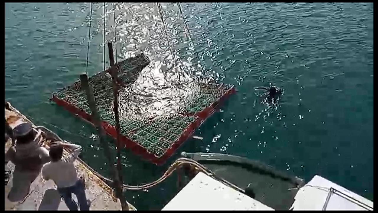 Η βύθιση των 5.000 μπουκαλιών ποιοτικού κρασιού από τοπικές ποικιλίες, πραγματοποιείται με τη βοήθεια γερανού.