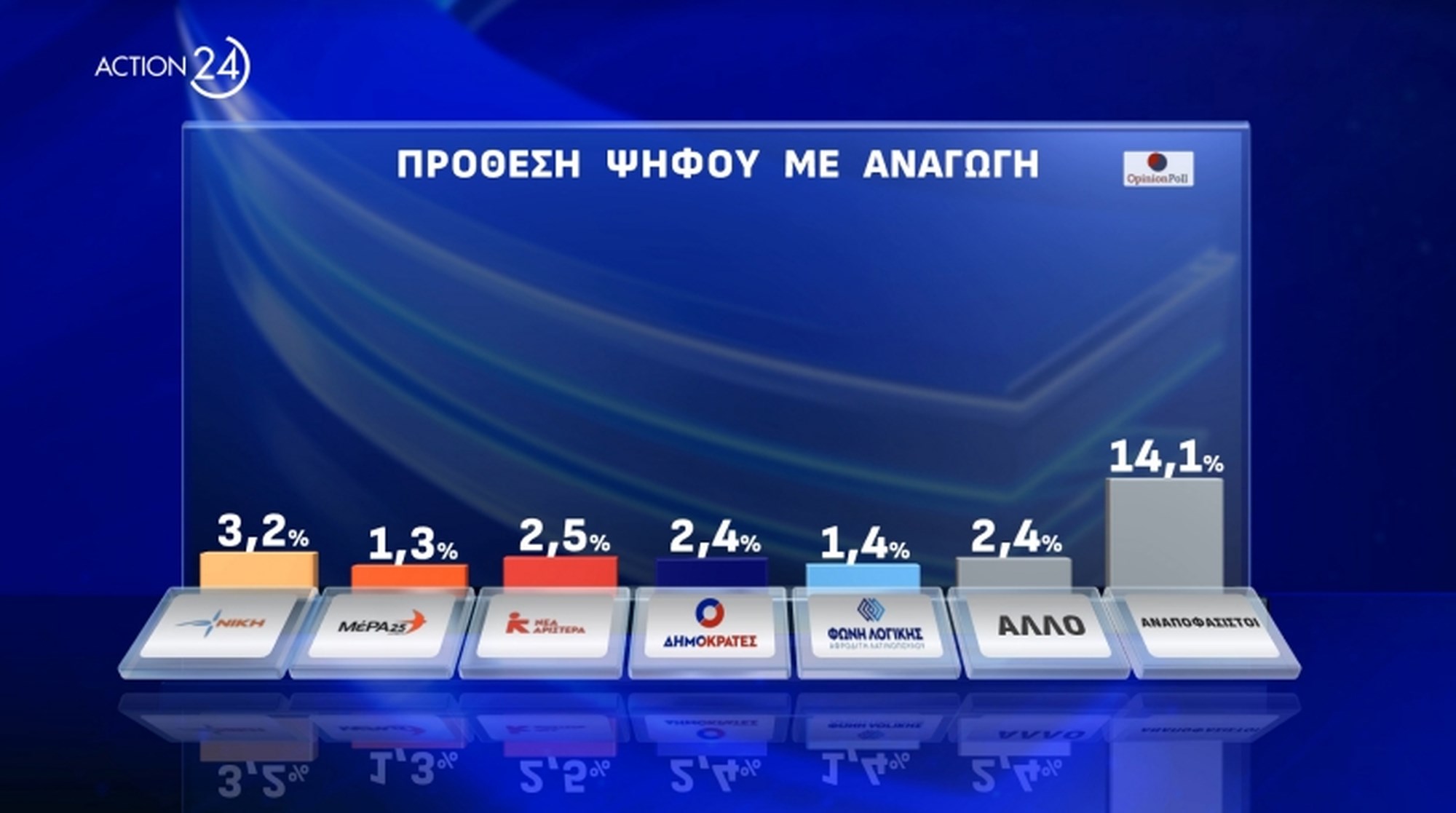 Στο 3,2% βρίσκεται η Νίκη, στο 1,3 το ΜέΡΑ25, στο 2,5% η Νέα Αριστερά, στο 2,4% οι Δημοκράτες, στο 1,4 η Φωνή Λογικής, ενώ οι αναποφάσιστοι αγγίζουν το 14,1%.