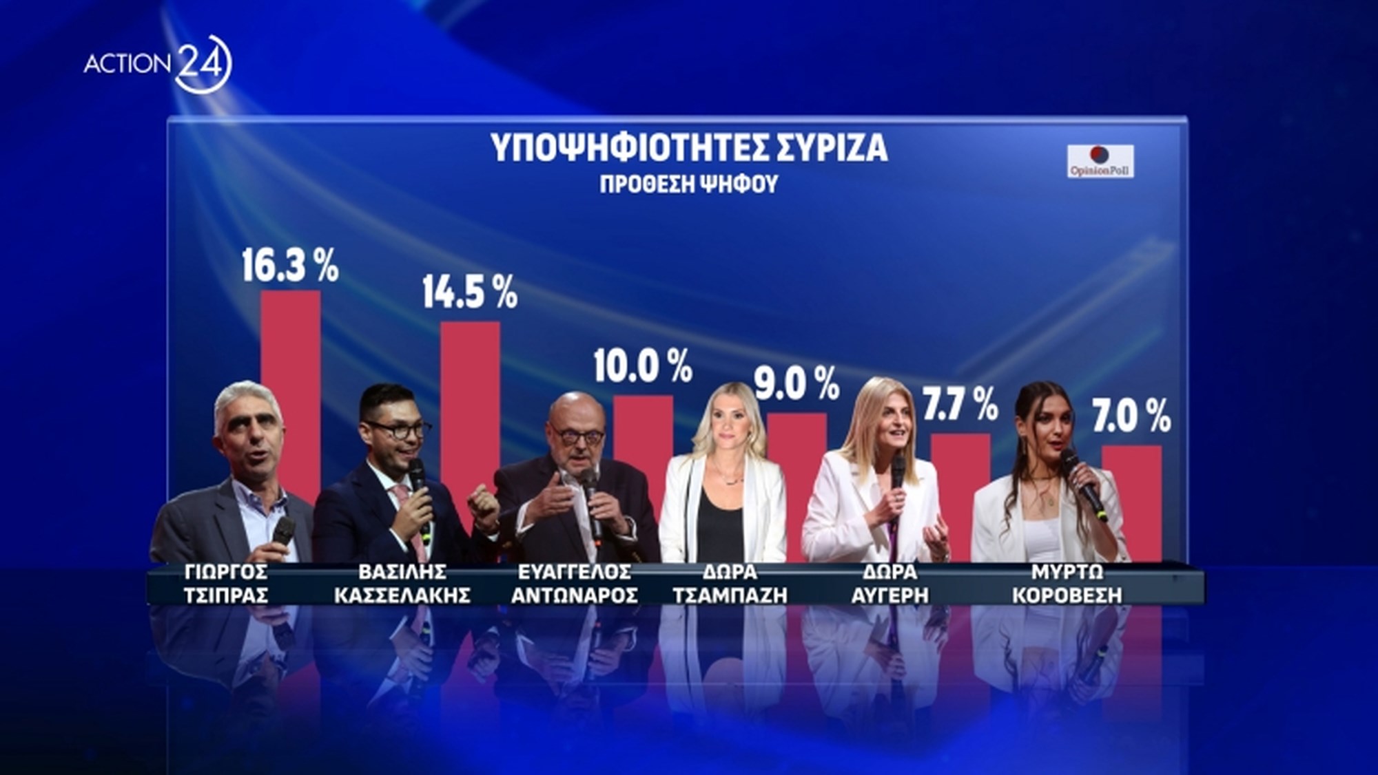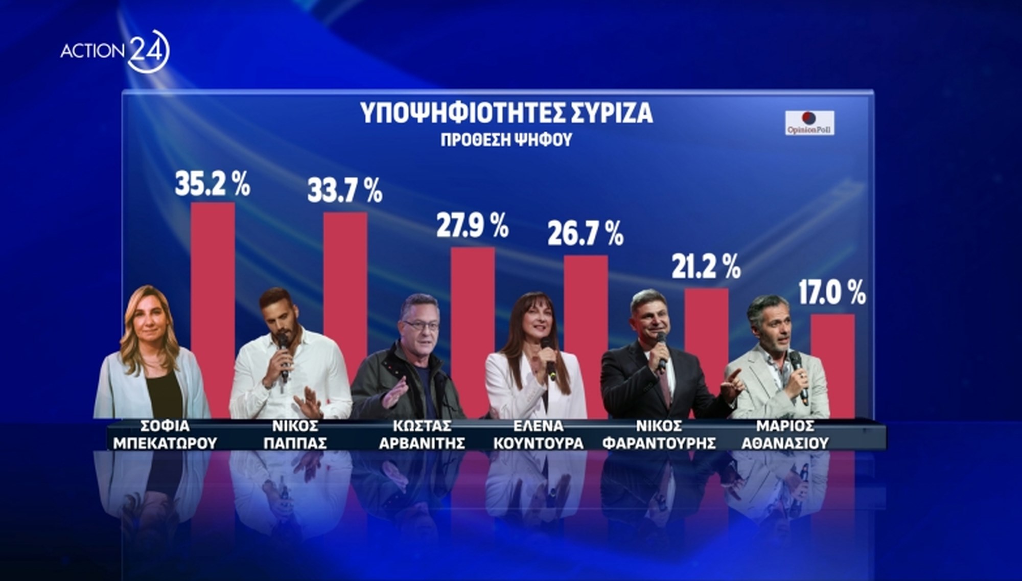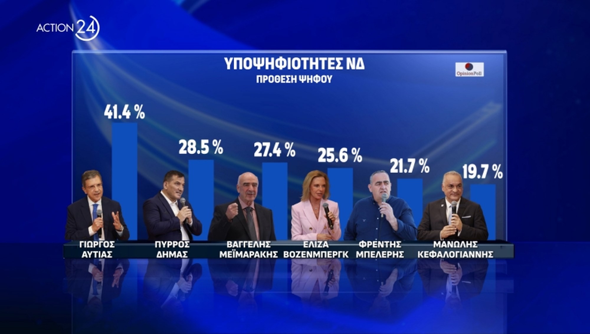 Ιδιαίτερο ενδιαφέρον έχει η δημοσκόπηση της Opinion Poll, για λογαριασμό του Action24, καθώς εκτός από την πρόθεση και εκτίμηση ψήφου ενόψει ευρωεκλογών, για πρώτη φορά καταγράφεται η σειρά προτιμήσεων της κοινής γνώμης για τους υποψήφιους ευρωβουλευτές της ΝΔ και του ΣΥΡΙΖΑ.