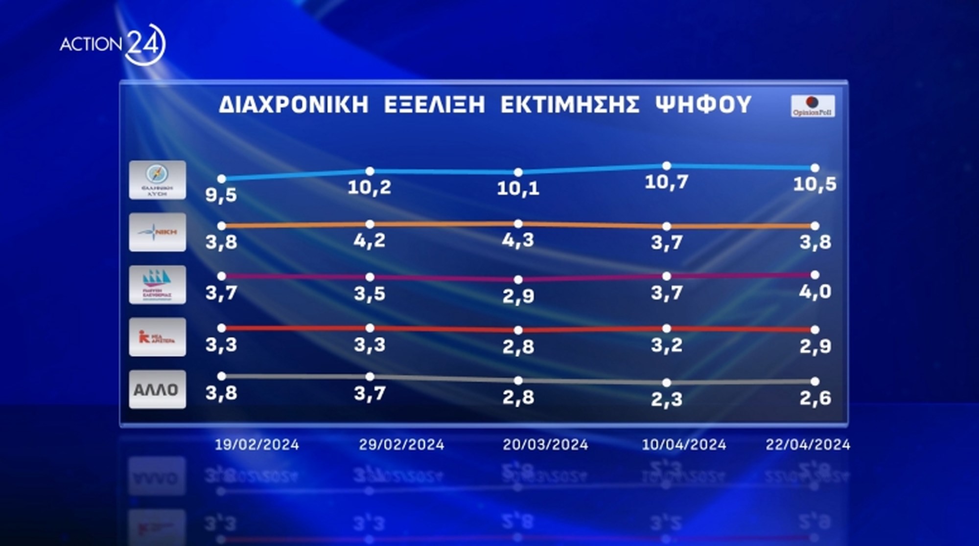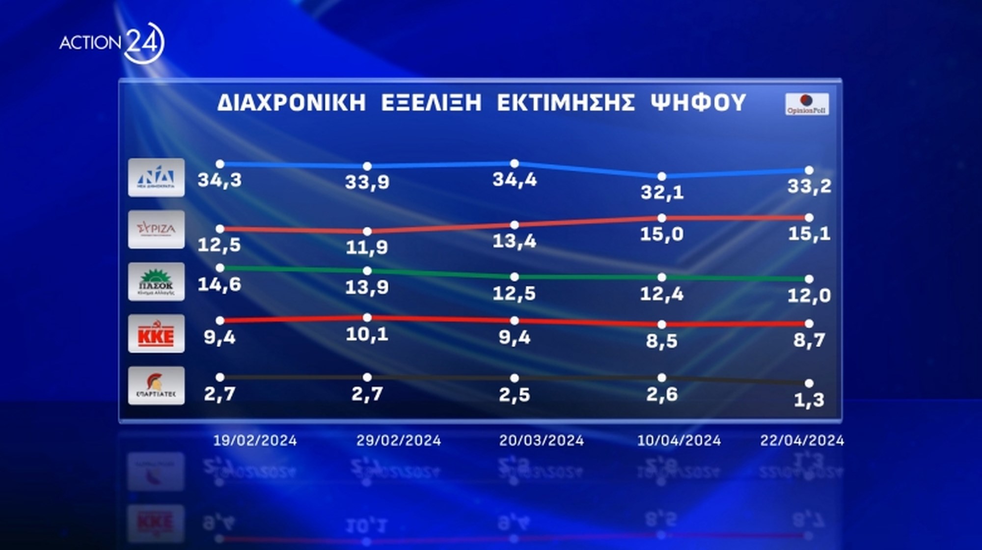 Στη διαχρονική εξέλιξη εκτίμησης ψήφου, η ΝΔ έχει μια μικρή αύξηση σε σχέση με την προηγούμενη μέτρηση, ο ΣΥΡΙΖΑ παραμένει σταθερά δεύτερος ενώ το ΠΑΣΟΚ δείχνει μια μικρή πτώση. Το ΚΚΕ επίσης φαίνεται να "τσιμπάει" λίγο, ενώ η Ελληνική Λύση παραμένει σταθερά 4ο κόμμα.