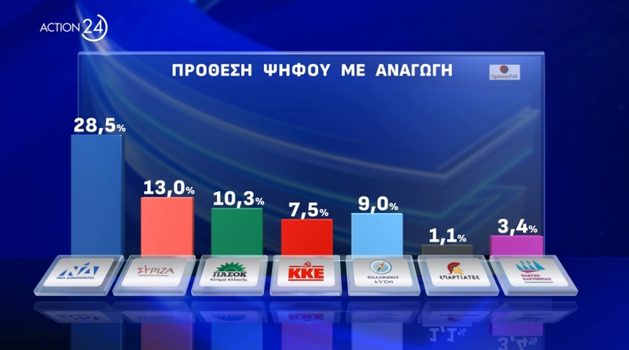 Στην πρόθεση ψήφου με αναγωγή, η ΝΔ είναι πρώτη με ποσοστό κάτω του 30% και συγκεκριμένα με 28,5%. Στη δεύτερη θέση ο ΣΥΡΙΖΑ με 13% και τρίτο το ΠΑΣΟΚ με 10,3%, ενώ η Ελληνική Λύση με 9% περνά το ΚΚΕ (7,5%).
