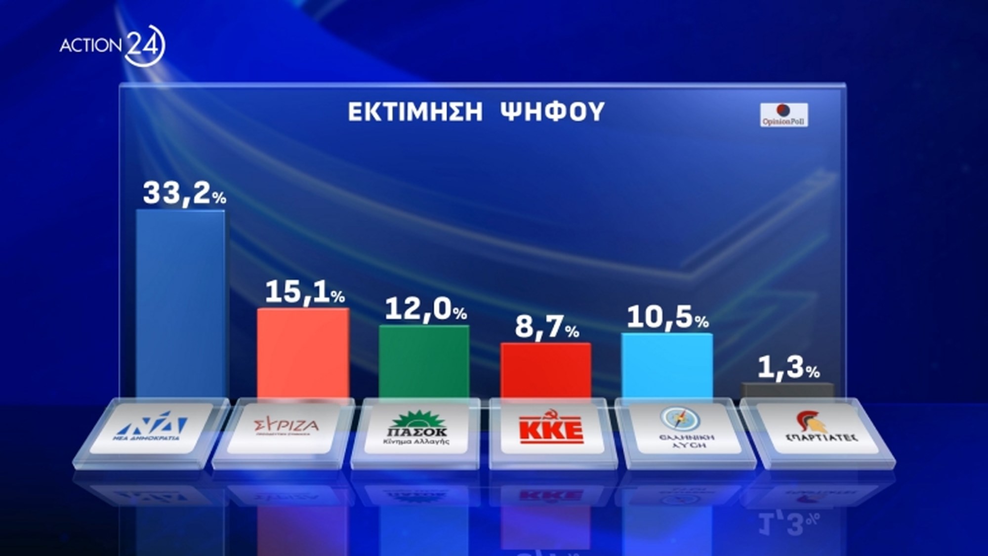 Στην εκτίμηση ψήφου, η ΝΔ συγκεντρώνει 33,2%, ο ΣΥΡΙΖΑ 15,1% και το ΠΑΣΟΚ 12%. Η Ελληνική Λύση έρχεται τέταρτη με 10.5% και το ΚΚΕ πέμπτο με 8,7%.