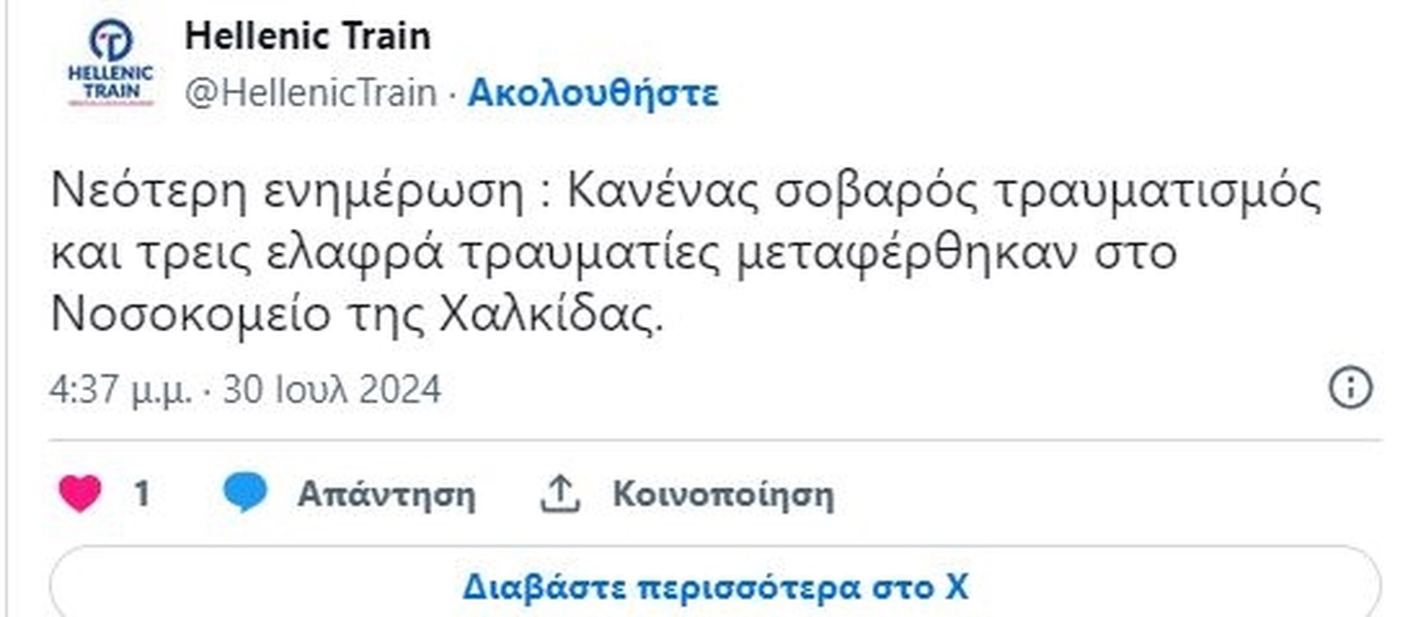 Σύμφωνα με νεότερη ενημέρωση της Hellenic Train, από το συμβάν δεν προκλήθηκε κάποιος σοβαρός τραυματισμός. Ωστόσο, τρεις ελαφρά τραυματίες μεταφέρθηκαν στο Νοσοκομείο της Χαλκίδας.