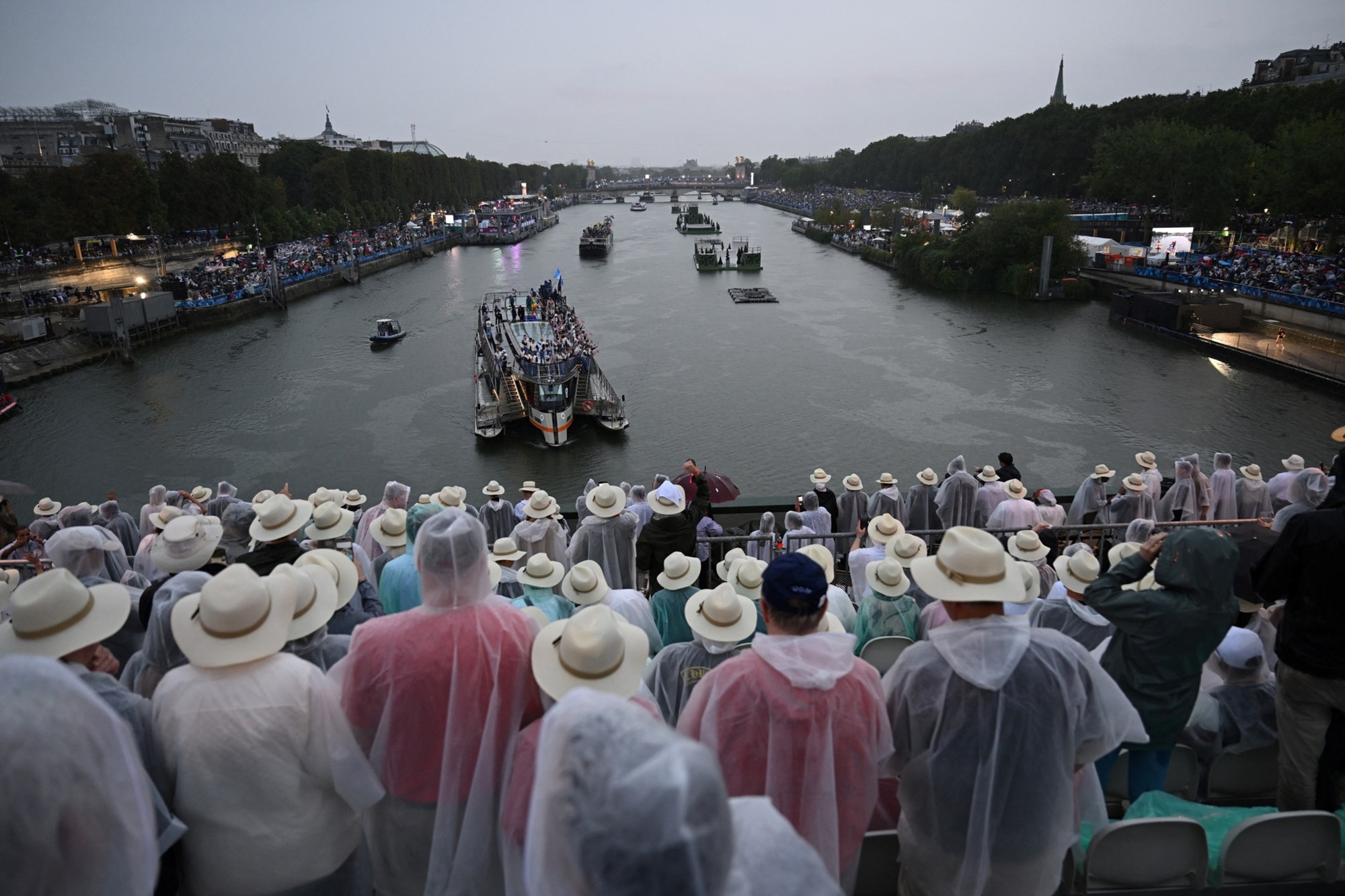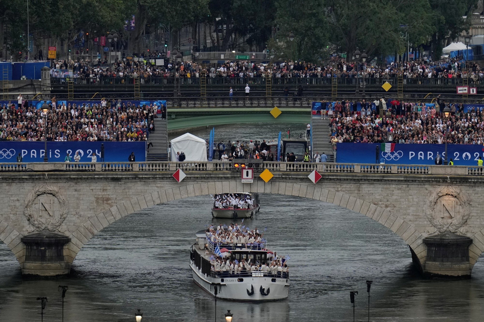 Το σκάφος της Ελλάδας, διέσχισε τη γέφυρα Αούστερλιτς , γύρω στις 20:40 όταν ένας τοίχος με νερό που χύνεται κάτω από τη γέφυρα άνοιξε, ελευθερώνοντας το πέρασμα για αυτό το σκάφος, το πρώτο από τα 85 που πρέπει να μεταφέρει περισσότερους από 6.500 αθλητές στο Τροκαντερό.