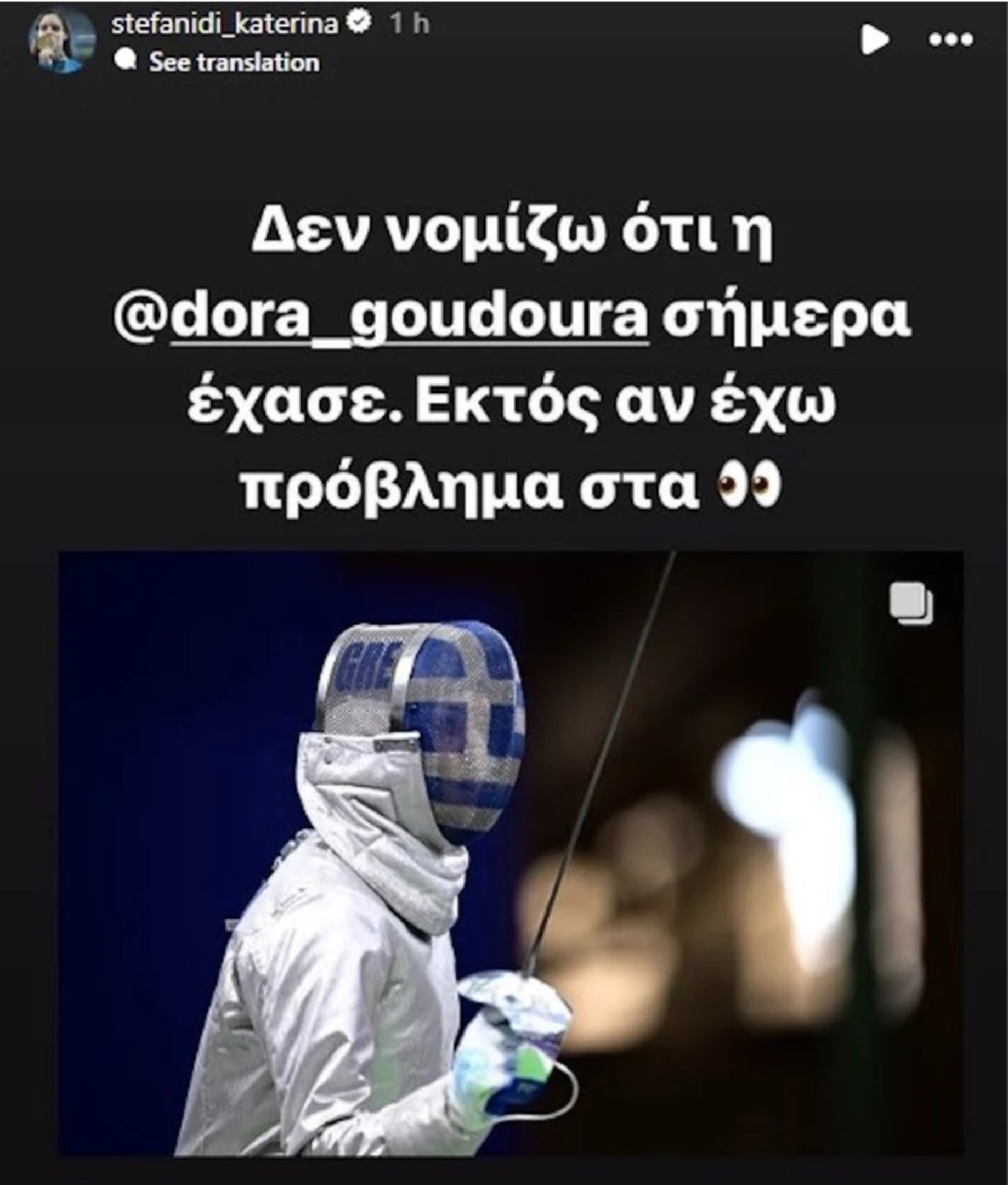 Η Κατερίνα Στεφανίδη σχολίασε στο Instagram τον ρόλο της διαιτησίας που οδήγησε έξω από τους "8" την Ελληνίδα αθλήτρια της ξιφασκίας.Τη Δώρα Γκουντούρα την αθλήτρια της ξιφασκίας που έχασε τον δρόμο για τα ημιτελικά στους Ολυμπιακούς Αγώνες 2024 στο Παρίσι εξαιτίας περίεργων αποφάσεων των διαιτητών, στήριξε με ανάρτησή της η ολυμπιονίκης του επί κοντώ, Κατερίνα Στεφανίδη.