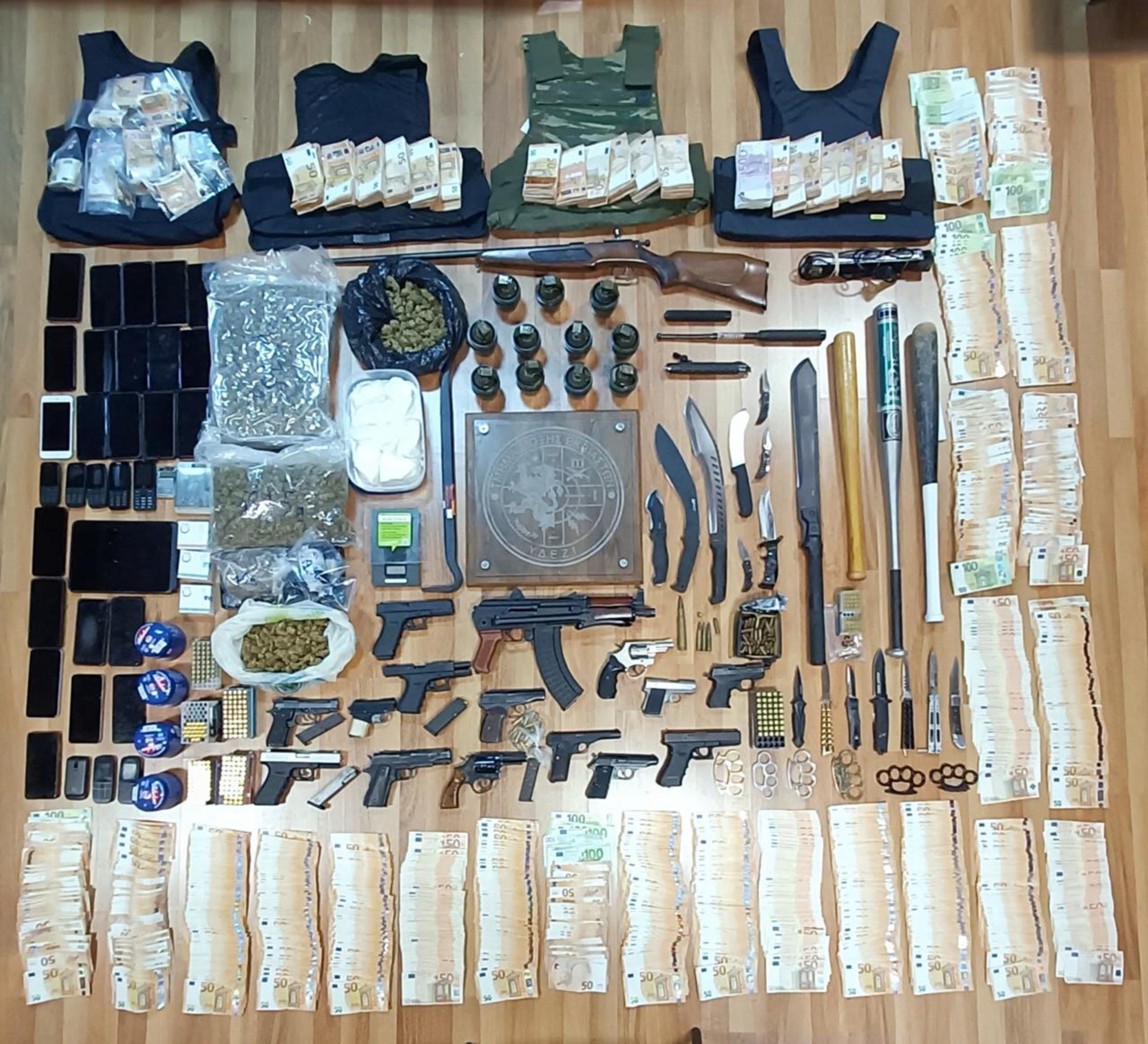 Τα στελέχη του Τμήματος Δίωξης Εκβιαστών, στην επιχείρηση με τον κωδικό OBLUST, συνέλαβαν 17 άτομα, εκ των οποίων τρεις είναι έγκλειστοι φυλακών, ενώ κατηγορούνται ακόμη 32, για συμμετοχή σε εκβιαστική ομάδα που καταγράφει πάνω από 78 εκβιασμούς, 3 εκρήξεις, 5 εμπρησμούς, ξυλοδαρμούς. Σε αυτή την ομάδα συμμετέχουν πολλοί χούλιγκαν του ΠΑΟ, εκ των οποίων 4 ήταν ανάμεσα στους 74 συλληφθέντες του περασμένου Σαββάτου, και πρωταγωνιστικά μέλη στην εκβιαστική ομάδα. Δύο από αυτούς είχαν πρόσβαση σε αποθήκη οπλισμού σε σπίτι στα Άνω Λιόσια, όπου βρέθηκε ένα πολεμικό καλάσνικοφ, 8 πιστόλια, δύο περίστροφα, 11 χειροβομβίδες, μαχαίρια, αλεξίσφαιρα γιλέκα, 800 γραμμάρια κοκαΐνης, 2 κιλά χασίς, περίπου 250.000 ευρώ, σημειωματάριο με περιοχές, ονόματα, χρηματικά ποσά.