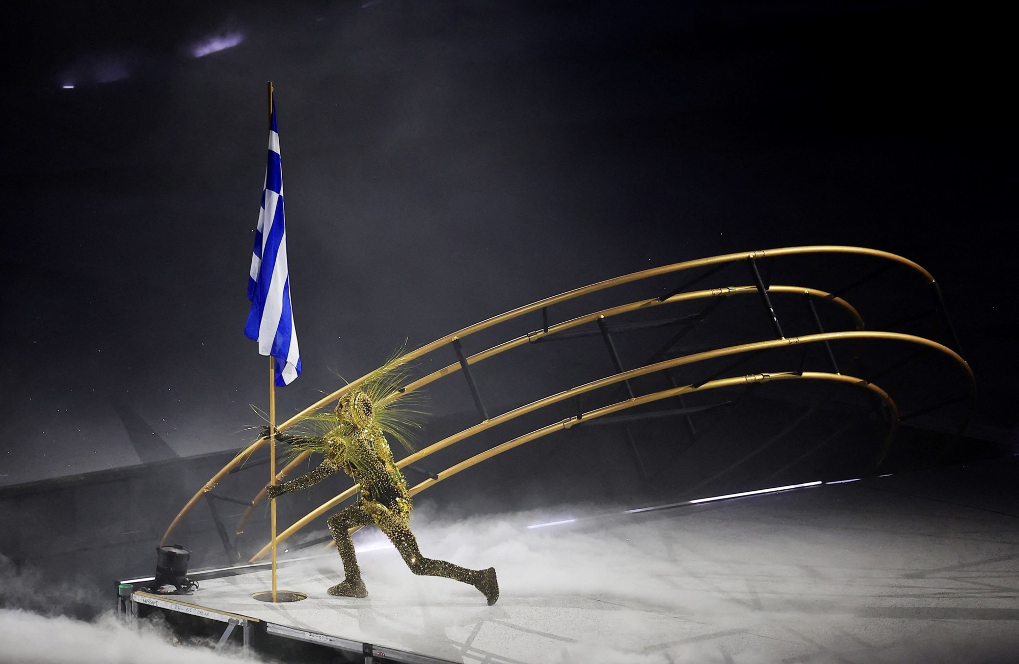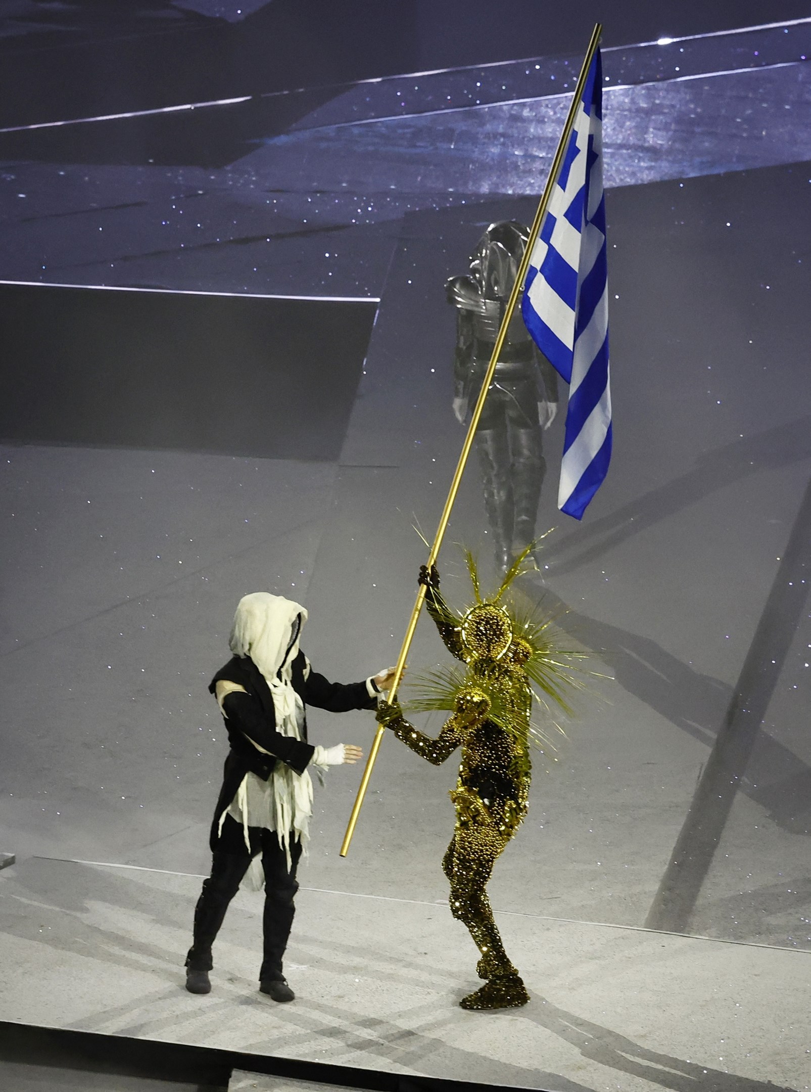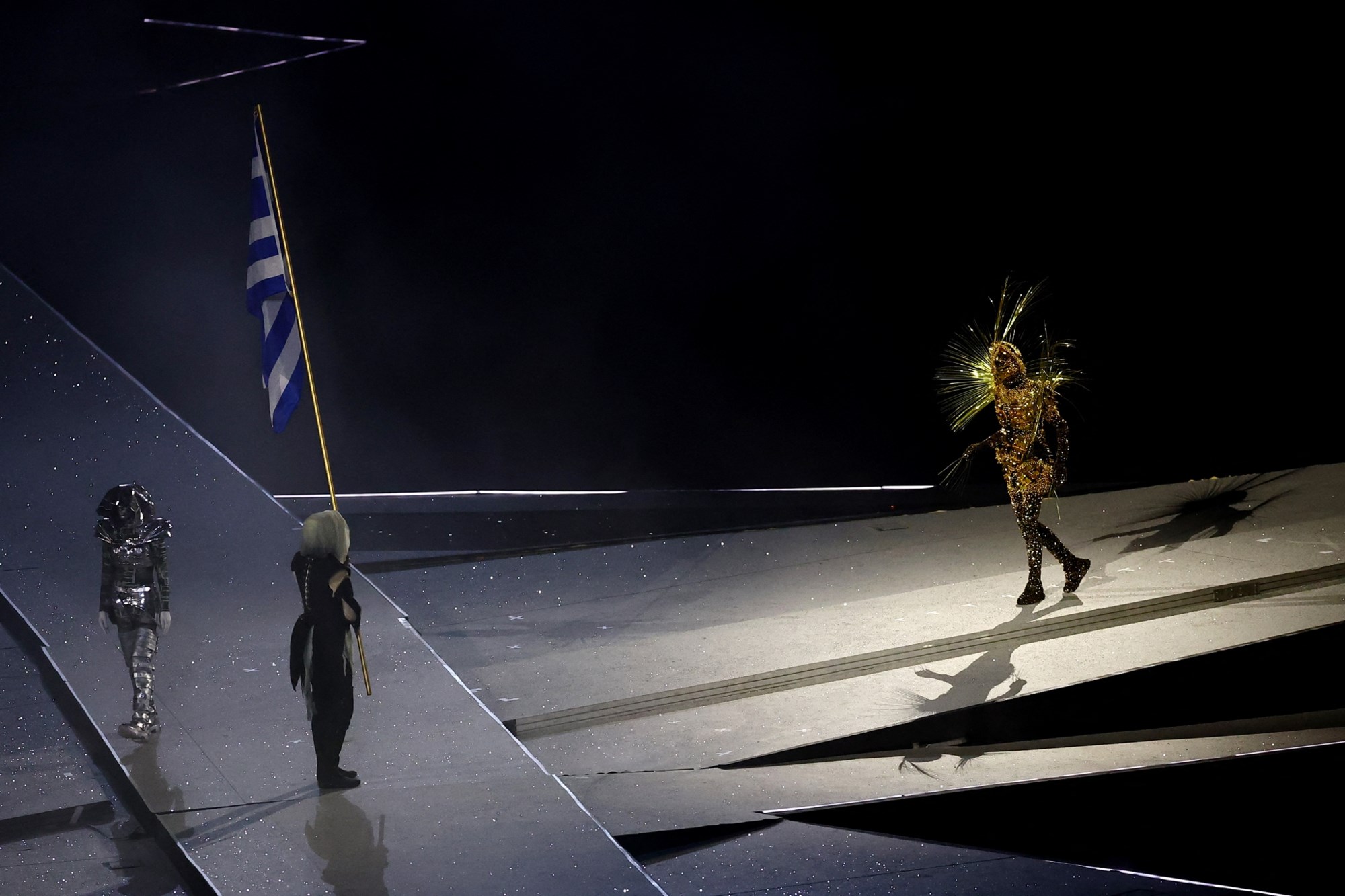 Η ελληνική σημαία μπήκε στο Stade de France υπό τον ήχο του Εθνικού Ύμνου και έδωσε το… φως σε έναν δυστοπικό κόσμο χωρίς Ολυμπιακούς Αγώνες, ενώ στη συνέχεια την εμφάνισή της έκανε το άγαλμα της Νίκης της Σαμοθράκης, το οποίο και βρίσκεται στο Λούβρο.