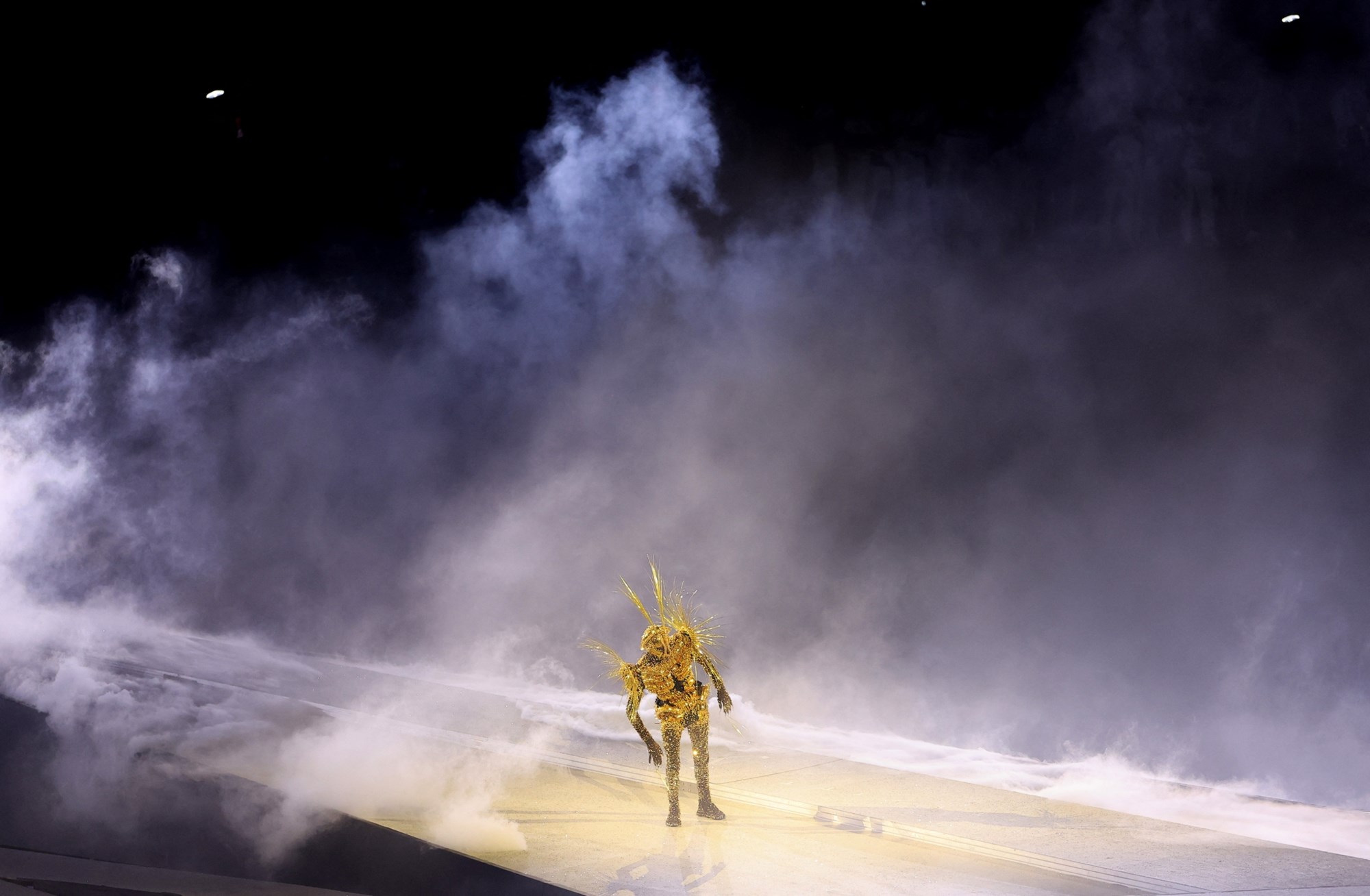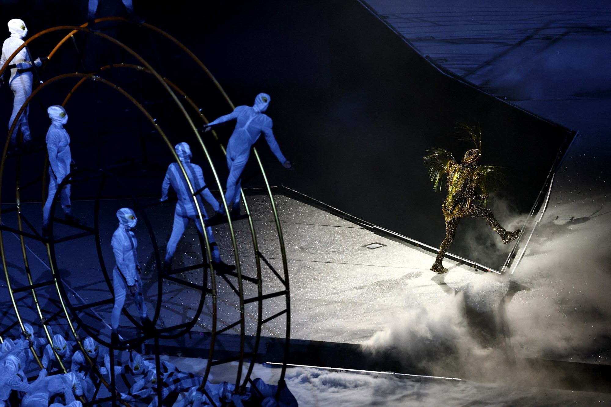 Το "Stade de France" βυθίστηκε στο σκοτάδι για την έναρξη της παράστασης, που ονομάζεται "Records", "μεταφέροντας" θεατές και τηλεθεατές σε έναν άλλο κόσμο, με πρωταγωνιστή χαρακτήρα τον "χρυσό εξερευνητή", ο οποίος κατέβηκε από την οροφή του σταδίου, εμπνευσμένος, από πολλές αναφορές από τη γαλλική ιστορική κληρονομιά, ξεκινώντας από την ιδιοφυΐα της Βαστίλης, καθώς και από πλάσματα της επιστημονικής φαντασίας και βιντεοπαιχνίδια.