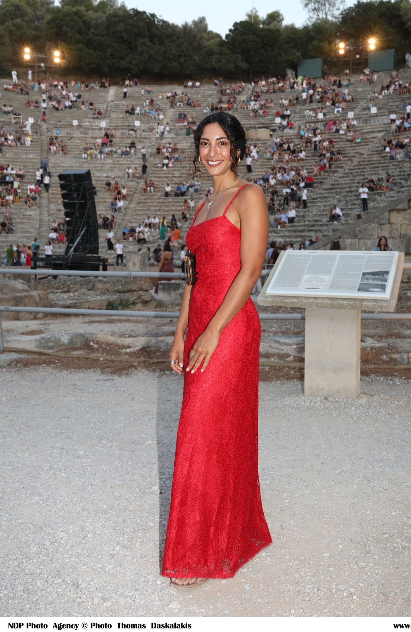 Η Ευγενία Σαμαρά, η οποία προσέχει πάντοτε το στυλ της, επέλεξε για την εμφάνισή της στην Επίδαυρο, ένα κατακόκκινο μάξι φόρεμα που αναδείκνυε και το υπέροχο μαύρισμά της και φλατ σανδάλια.