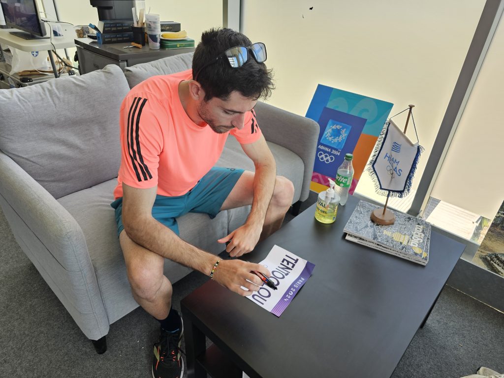 Φωτογραφία από τη στιγμή που ο Μίλτος Τεντόγλου υπογράφει το αγωνιστικό του bib
