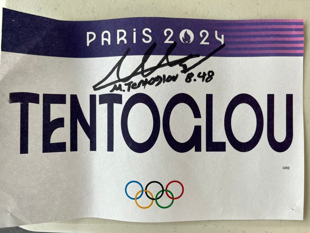 Σε αυτό έγραψε το όνομά του, έβαλε την υπογραφή του και σημείωσε πάνω σε αυτό τον αριθμό 8.48, δηλαδή την επίδοση που του χάρισε το χρυσό μετάλλιο για δεύτερη συνεχή Ολυμπιάδα.